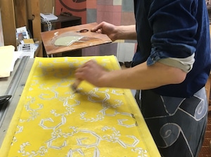 型防染という型紙を使って糊を引いて、染めあげる染色技法。